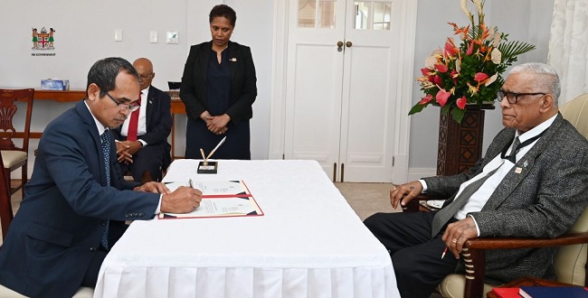 Joaquim da Fonseca menandatangani akta Sumpah Setia dan Sumpah untuk Pelaksanaan Tugas yang Sah sebagai Ketua Komisi Kebenaran dan Rekonsiliasi Fiji pada 29 Januari 2026. Foto FijiNews